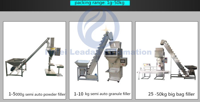 This series semi-automatic packing machine mainly consist of feeding equipment, weighing hoppers and electronic control system. It can complete feeding, weighing and packing work independently. Suitable for variety packaging containers(bags, cans, bottles, etc.) with various size, the packing weight varies from 100g to 5000g by changing amounts of its hopper.